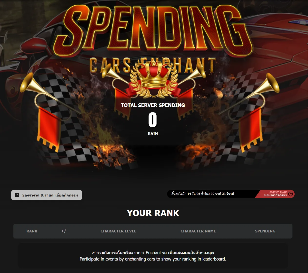1.กิจกรรม "Car Enchant Spending" ผู้เล่นต้องที่การรับของรางวัลต้องใช้จ่าย Rain ไปกับ Car Enchant ตามที่กำหนด