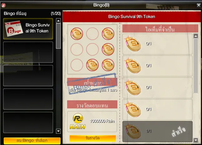 เมื่อกดใบบิงโกจะปรากฎเงื่อนไขในการบิงโกตามตัวอย่างในภาพ